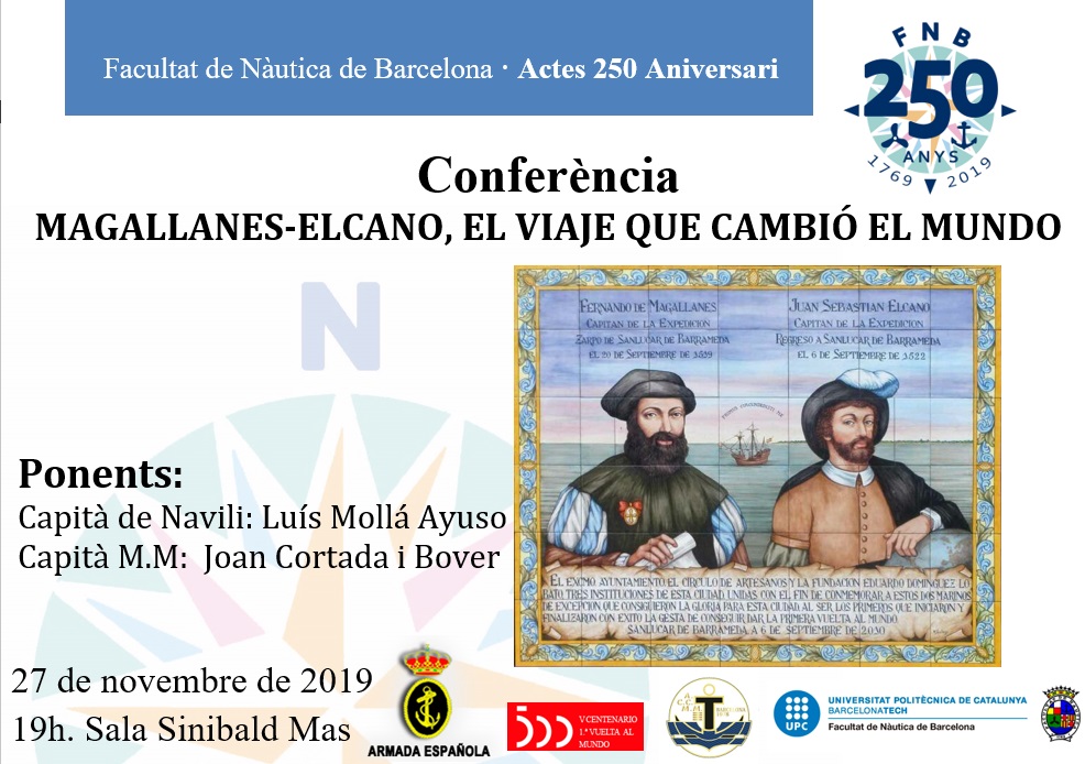 Dintre dels actes organitzats en commemoració del 250è aniversari de l'FNB, us informem que el proper dimecres dia 27 de novembre a les 19h tindrà lloc a la Sala d'Actes Sinibald Mas, la conferència "Magallanes-Elcano, el viaje que cambió el mundo" a càrrec dels ponents: Luís Mollá Ayuso, Capità de Navili i de Joan Cortada i Bover, Capità de la Marina Mercant. L'acte és obert a tothom que estigui interessat.